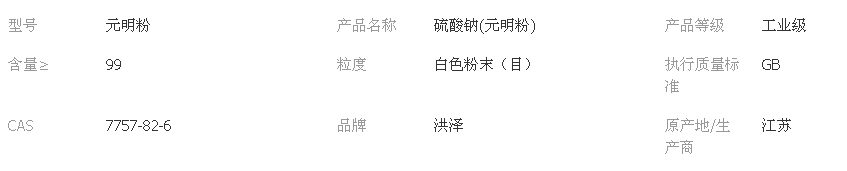 硫酸鈉又叫元明粉,是無水化合物,白色、無臭、有苦味的結晶或粉末,有吸濕性。外形為無色、透明、大的結晶或顆粒性小結晶。