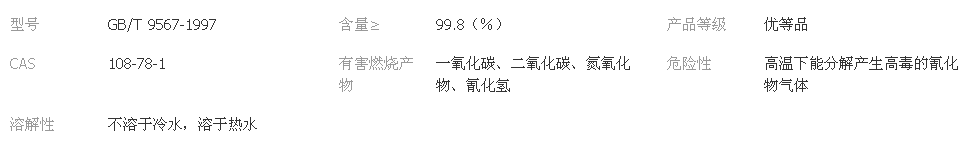 制造三聚氰胺甲醛樹脂的主要原料,用作有機元素分析試劑,也用于有機及樹脂的合成作皮革加工的鞣劑和填充劑。與甲醛縮合聚合可制得三聚氰胺樹脂,可用于塑料及涂料工業,也可作紡織物防摺、防縮處理劑。其改性樹脂可做色澤鮮艷、耐久、硬度好的金屬涂料。