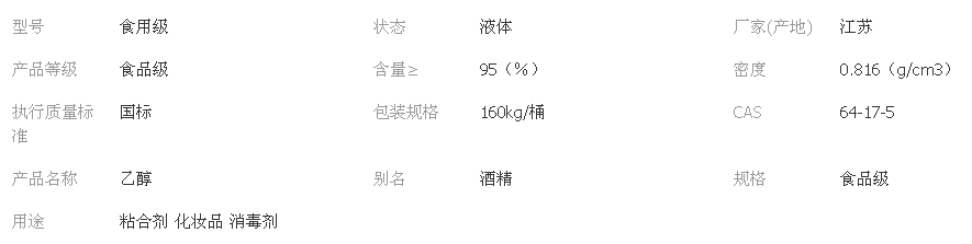 無色透明液體(純酒精),有特殊香味,易揮發。能與水、氯仿、乙醚、甲醇、丙酮和其他多數有機溶劑混溶,相對密度(d15.56)0.816。乙醇液體密度是0.789g/cm3, 乙醇氣體密度為1.59kg/m3,沸點是78.4℃,熔點是-114.3℃,易燃,其蒸氣能與空氣形成爆炸性混合物,能與水以任意比互溶。